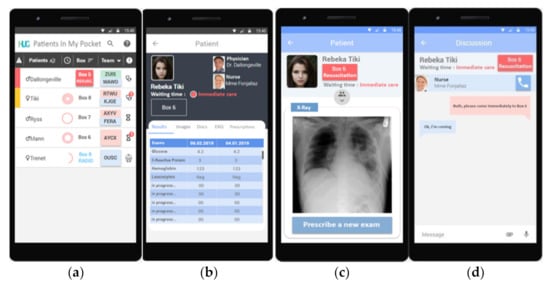 PIMPmyHospital screenshots. (a) Color-coded bars represent patient status on the five-level Canadian Triage and Acuity Scale []; patient gender and identity; time since admission as radial circular timers; patient allocation per room; color-coded box of individuals in charge of the patient; and patient status (seen by a physician, waiting for results, CT-scan in progress, etc.). Push notifications prompt the user to be aware of the situations. (b,c) Selecting a patient opens a new page with scrollable contextual tab menus containing information related to laboratory results, imaging, patient files, electrocardiograms, and prescriptions entered in the computerized institutional prescription software. (d) The instant messaging system. The logos at the bottom of the screen represent the possibility to also import and link documents to the conversion as well as to send voice memos. Adapted from [].