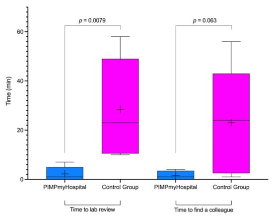 Boxplots of time to laboratory review and time to find a colleague when using the mobile app compared to conventional methods. Solid horizontal lines denote median and IQR; the endpoints of the whiskers indicate the range. The long upper whiskers show that participants were more varied among the most positive quartile groups. The cross denotes the mean.