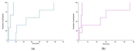Figure 3 shows that the median time to review laboratory results once available was significantly reduced from 23 min (interquartile range (IQR) 10.5–49.0 min) to 1 min (IQR 0–5.0 min) with the use of the app compared to the patient’s EHR. All participants who used the app accessed these results at most within 7 min of their publication, whereas it took up to 58 min for participants who did not use the app (Figure 4), i.e., a 92.2% reduction in mean post-analytical time to consider the laboratory results.