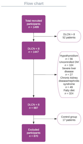 In a group of 1499 patients hospitalized between 1 December 2020 and 1 December 2021, we identified 52 patients with FH who met the following inclusion criteria: patients who signed informed consent, age over 18 years, and a DLCN score over 8. Patients who did not meet these conditions were excluded from the study. To exclude secondary hypercholesterolemia, any patient with at least one of the following was not included: hypothyroidism, uncontrolled DM, severe liver diseases, severe chronic kidney disease, nephrotic syndrome, and diets elevated in saturated and trans-unsaturated fatty acids. The control group included 17 patients with normal lipid values who signed informed consent and were over 18 years of age. The same exclusion criteria were applied as in the study group (Figure 1).