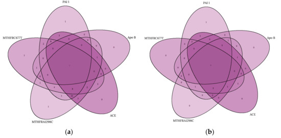 Figure 2b presents the genetic background of the patients included in the control group. All the patients had at least one of the polymorphisms studied. Most of the participants (94.11%) had at least two associated SNPs, followed by three and four, representing 82.3% and 29.4%, respectively. There were no patients diagnosed with all five studied SNPs. Some situations of multiplicity were more prevalent than others. Similar to the FH group, several scenarios of multiplicity were identified in the control group. Thus, the most frequent simultaneous association was found in five (29.4%) individuals that were diagnosed with MTHFR C677T, MTHFR A1298C, PAI-1, and ACE polymorphisms, followed by three (17.6%) cases that had polymorphisms in MTHFR C677T, PAI-1, and ACE. Only two (11.7%) of the study participants had SNPs in MTHFR A1298C, PAI-1, and ACE concomitantly.