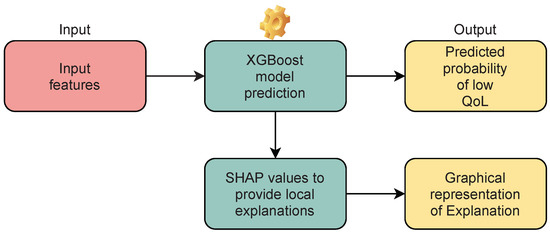 Architecture of C-ALS (input, process, and output). The input feature space consists of the three features that were identified to be predictive of QoL (the patient’s age at disease onset, the primary caregiver’s employment status before the onset of their caregiving duties, and the patient’s ALSFRS-R score for orthopnoea). The three features are used by the XGBoost model to predict the outcome in the form of a probability, while SHAP is used to provide local explanations for the specific prediction in the form of a graphical representation.