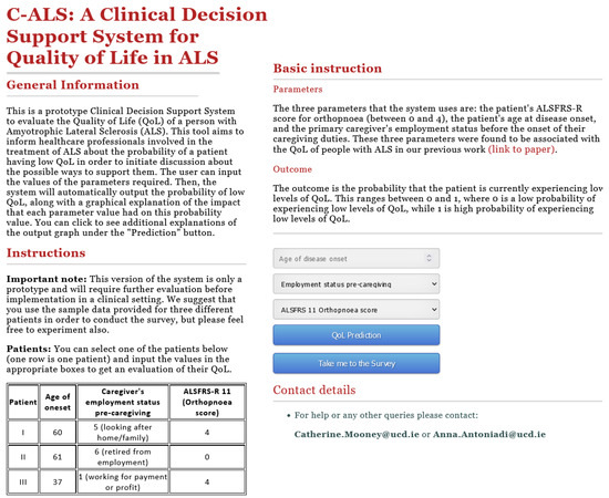 Based on the previously described model, we developed a CDSS interface. A screenshot of the first page of the C-ALS interface is shown in Figure 2; however, for better readability or to interact with the system, we advise that you visit http://lisda.ucd.ie/C-ALS, accessed on 7 February 2022. On the first page, we provide some information on the system: the aim, input, and output, along with some exemplar patients that we suggest the users to experiment with. On the bottom right of that page, the user can input the values and click to make a QoL prediction.
