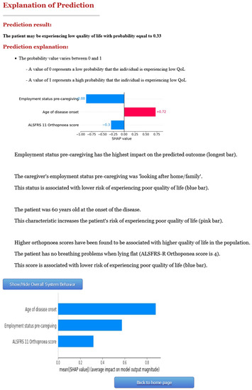 It also provides a general interpretation of the graph as follows: “Higher” in pink signifies that the parameter in pink is increasing the probability of having low QoL; “Lower” in blue signifies that the parameter in blue is decreasing the probability of having low QoL; A longer “effect line” signifies that the parameter is having a greater effect on increasing or decreasing the probability of having low QoL. In this particular example, the user could infer that the aspect that mostly affected this outcome was the caregiver’s employment. While this patient’s age at disease onset was related to low QoL, the caregiver’s employment status along with the patient’s orthopnoea score had a greater effect on eventually decreasing the probability of this patient experiencing low QoL.