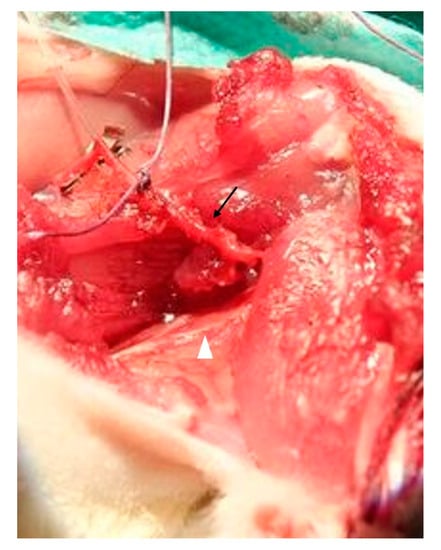 Figure 1. After surgical preparation, the gastrocnemius muscle was attached in situ via its vascular pedicle (arrow) and the tibial nerve (white arrowhead).