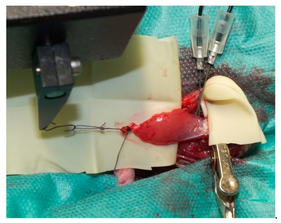 Donor animals were placed in the supine position on a heating plate. Dissection through the adductor muscles of the left hind limb was carried out under aseptic conditions until the medial gastrocnemius muscle was reached and freed from all muscular and tendon attachments. All vessels branching off the muscle except for the popliteal artery and vein, representing the main pedicle, were ligated. Popliteal vessels were tracked proximally up to their origin from the femoral vessels until the gastrocnemius muscle was solely attached in situ via its vascular pedicle and the tibial nerve (Figure 1). The distal tendon was then tied with a 4-0 Vicryl suture (Ethicon, Somerville, NJ, USA) and connected to a servomotor lever arm (model 305C Dual-Mode Lever Arm System; Aurora Scientific Inc, Aurora, Ontario, Canada), while the proximal tendon was fixed in a clamp on a self-constructed metal frame, placed under the heating plate (Figure 2). After stimulation of the gastrocnemius, the rat receiving the gastrocnemius muscle as a transplant was surgically prepared (see Section 2.4 for details).