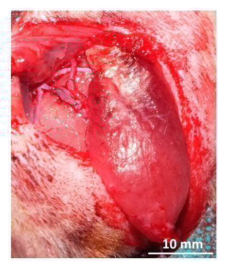 After two weeks of implantation, rats were again anesthetized as described above and placed in the supine position. The left hind limb was dissected and the isolation chamber was opened to expose the transplanted gastrocnemius muscle (Figure 5A). The muscles were taken out of the chamber and stimulation was carried out as described above. After that, muscles were perfused with the contrast agent Microfil® as described previously [13]. Briefly, laparotomy incision was performed and animals were perfused by flushing the aorta with 150 mL of heparine solution and afterward with 20 mL yellow Microfil® (MV-122) containing 2.5% of MV Curing Agent (both Flowtech, Carver, MA, USA) (Figure 5B). Finally, the aorta and inferior vena cava were ligated, and the rats were placed at 7 °C for 24 h. Constructs were explanted in toto and fixed in 3.5% formalin solution overnight and placed in PBS solution for microtomography (µCT) analysis.