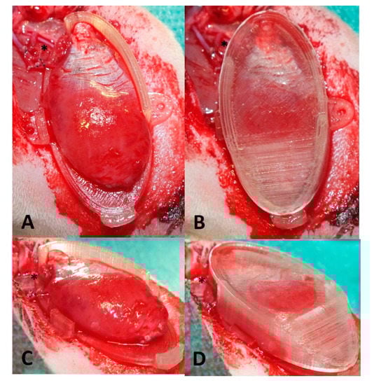 Figure 4. Different perspectives showing transplanted gastrocnemius muscle placed onto bottom part of isolation chamber (A,C) and into isolation chamber with lid on top (B,D). Note the opening of the chamber for the vascular pedicle (asterisk).