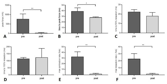 Figure 6. Force values before and 2 weeks after transplantation of the gastrocnemius muscle. Peak force (A), time to peak force (B), and maximum contraction and relaxation rate (E,F) decreased after transplantation while time to 50% and 100% relaxation (C,D) did not change (paired t-test). Level of significance was * p < 0.05, ** p < 0.01.