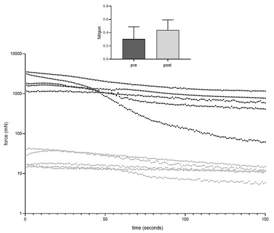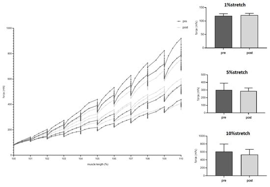 During fatigue testing, there was an obvious difference between pre and post transplantation groups (Figure 7). Nevertheless, fatigue index was similar between the two groups (p = 0.287). Passive stretch properties did not change after transplantation (Figure 8). For each % increase in length from 100–110%, contractile forces needed to maintain the respective length of the muscle did not differ between the two groups: 1% (p = 0.641), 2% (p = 0.707), 3% (p = 0.878), 4% (p = 0.832), 5% (p = 0.708), 6% (p = 0.631), 7% (p = 0.550), 8% (p = 0.437), 9% (p = 0.395), 10% (p = 0.323).