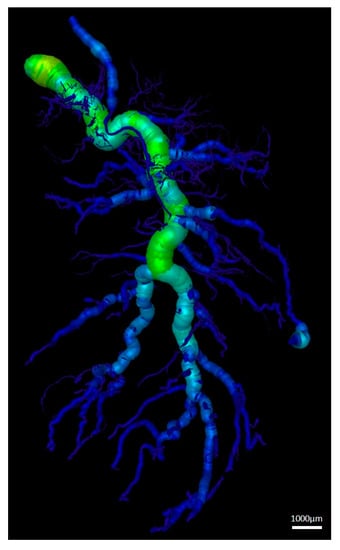Three-dimensional (3D) µCT scans showed the cumulative lengths for different vessel radius ranges (Table 3 and Figure 9). Vessels with smaller radii (measuring 5–45 µm and 55–95 µm) were the highest in number and cumulative length. The larger the radius of the vessels the lower was the cumulative length.