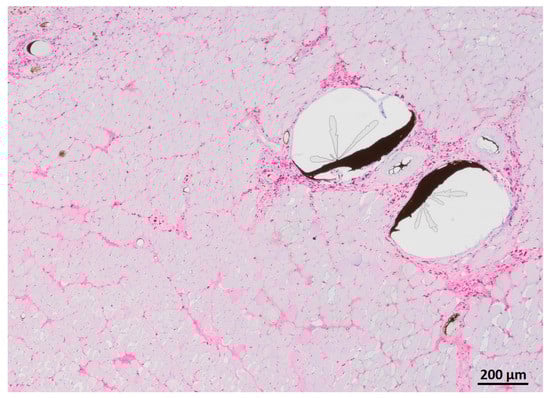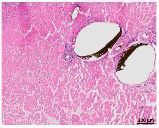 HE staining showed partly well-preserved structures as well as partly inhomogenous and irregularly arrangement of the skeletal muscle similar to MHC staining (Figure 11). CD68 staining revealed invasion of macrophages, especially near the vessels (Figure 12).