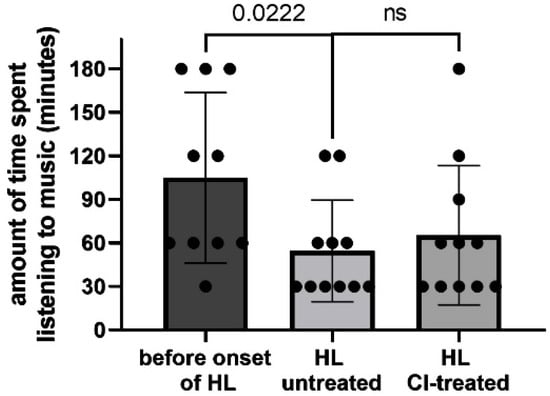 The MUMU questionnaire contains 25 questions; here summarized are only the ones where the authors expected an impact of MT. Questions such as “What kind of music do you listen to”, “If you sing, indicate where”, “If you sing, please indicate what” were not statistically evaluated. With regards to the results on how long the participants listened to music, it was noticed that there was no significant difference before HL was established, when the hearing loss became established and after the patients received a CI (p = 0.629), neither did the outcomes significantly differ among NH subjects (p = 0.123). Even though, it appeared when comparing the mean values as if the patient reduced perceiving and showing interest in listening to music slightly with onset of HL, which positively increased again after hearing rehabilitation with a CI (mean: 5.36 ± 3.38, 4.56 ± 3.80 and 4.91 ± 3.18, respectively (p = 0.800). NH mean: 7.0 ± 2.75 (p = 0.313)). The role of music in the life of the participants was not significantly different in any of the stages, nor compared to the NH group (p = 0.085). The amount of time spent listening to music was significantly different before the onset of HL and with HL present but untreated (p = 0.02); no difference was found after CI treatment (p = 0.441) (Figure 1).