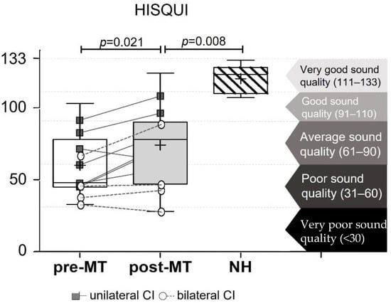 Evaluating the HISQUI outcomes grouped into the respective categories of sound quality, before MT, a mean of 60 ± 21.8, which corresponds to poor sound quality, was found. After the MT sessions, the mean significantly increased to 74.2 ± 27.5 (Figure 2, Table 3) for the moderate/average sound quality group (p = 0.021).