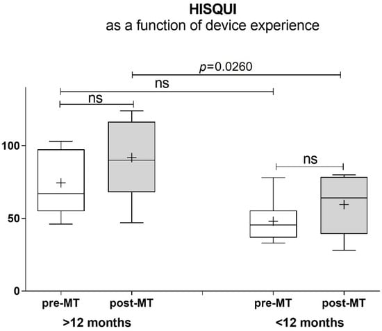 Additionally, the HISQUI as a function of the duration of the CI use was investigated, showing a significant difference in sound quality impression in the experienced group with more than 12 months of CI use compared to under 12 months of device use (p = 0.026) (Figure 3).