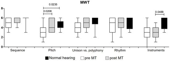 The outcomes of the MWT in the NH showed that the sound sequences were correctly recognized in 95%, with a mean of 5.7 ± 0.9 correct answers out of 6, which in the CI group before MT was 4.8 ± 0.9 and improved after MT to 5.5 ± 0.7 (p = 0.1048).