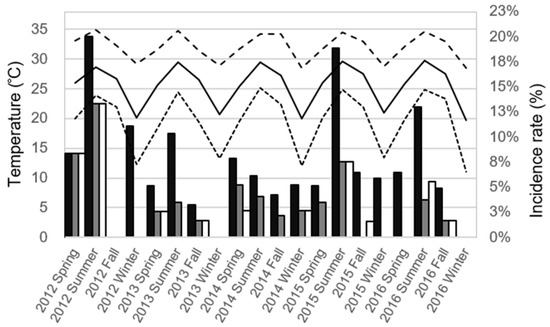 The distribution of seasonal infectious complications rates and temperatures in the continuous 5 year time period in Kaohsiung, Taiwan. The column represents the seasonal rate of infectious complications after a transrectal ultrasound-guided prostate biopsy (black column: urinary tract infection; gray column: sepsis; white column: positive culture finding). The line represents the average monthly temperature during the season (black solid line: average temperature; dense dotted line: lowest temperature; loose dotted line: highest temperature).