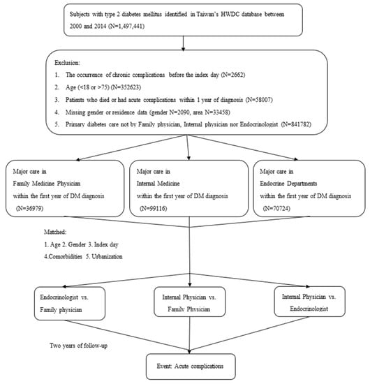 We selected subjects from the HWDC aged 18–75 years between 2000 and 2014. These subjects were followed for one year to verify the diagnoses of new-onset type 2 diabetes mellitus and then followed for two more years for data collection of diabetes care quality. The index day was defined as when the patient was diagnosed with new-onset type 2 diabetes, which was one year after entering the study. The study endpoint was defined as the day of the diagnosis of acute complications, death, or until 31 December 2017. We collected information such as age, gender (male/female), level of urbanization (high/moderate/low), frequency of insulin usage during the first month of diagnosis, and comorbidities according to the Charlson comorbidity index (Supplemental Table S1) at baseline (i.e., the index date). Participants with new-onset type 2 diabetes were defined as those meeting at least one of the following inclusion criteria: [20,21] (1) one or more inpatient admissions with a diagnosis of diabetes mellitus; (2) four or more outpatient visits within a 1-year period, each with a diagnosis of diabetes mellitus; or (3) outpatients who were diagnosed with diabetes mellitus and prescribed diabetes drugs during the same visit. Participants were excluded if they were any of the following: (1) not new-onset type 2 diabetes (i.e., specifically excluded those with any diabetes mellitus diagnosis prior to 2000, or the first year of study entry), occurrence of chronic complications suspected to be secondary to diabetes (i.e., diabetic renal, ophthalmic, neurologic, and peripheral vascular disease) before the diagnosis of diabetes mellitus (n = 2662); (2) the primary care physician in the majority of clinical visits during the first and follow-up year was not a family physician, endocrinologist, or other internist (n = 841,782); (3) patients aged <18 or >75 years (n = 352,623); (4) patients who had no available data on sex or residence (sex n = 2090, area n = 33,458); (5) patients who died or had acute complications within 1 year of diagnosis (n = 58,007).