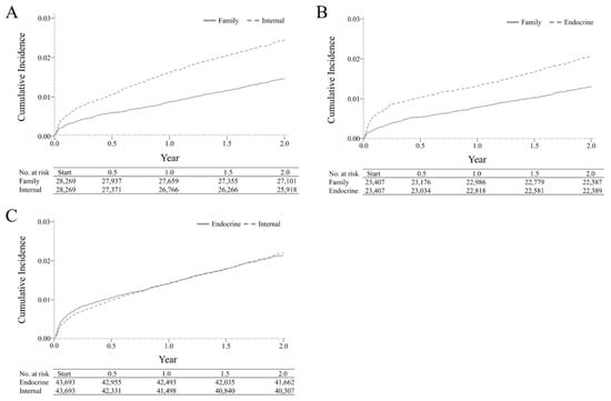 Cumulative Incidences of Acute Complications. (A) Family medicine and other internal medicine cohorts. (B) Family medicine and endocrinologist cohorts. (C) Other internal medicine and endocrinologist cohorts. The survival curves of cumulative incidence risks of acute complications for the FM, IM, and endocrinology cohorts were compared in pairs using the log-rank test. (A) Trends revealed that the cumulative incidence risks of developing acute complications in the IM cohort were greater than those in the FM cohort over time. (B) Cumulative incidences of acute complications in the FM cohort were lower than those in the endocrinologist cohort over time. (C) Trends revealed that the cumulative incidence of risks of developing acute complications in the endocrinologist cohort seemed greater initially but became lower than that in the IM cohort eventually.