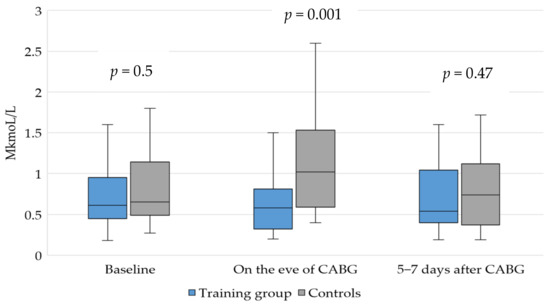 Performing exercise in the preoperative period did not significantly affect the serum ADMA. Higher ADMA levels were noted on the eve of CABG in the control group compared to the baseline values (1.6-fold increase, p > 0.05), and a statistically significant 1.8-fold increase in ADMA was noted in the controls compared to the training group at the end of the training program (p = 0.001). In the postoperative period, the concentration of ADMA in the training group did not change and remained within the reference values, whereas in the control group, the ADMA level returned to the baseline values. There were no intergroup differences in ADMA concentration after the procedure.