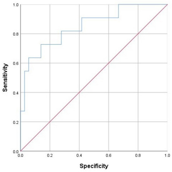 Thus, according to the obtained coefficients, the presence of type 2 diabetes increased the probability of complications in the early postoperative period 12 times (OR: 12.3; 95% CI: 1.24–121.5; p = 0.03). An increase in ET-1 concentration on the eve of surgery also increased the likelihood of complications (OR: 10.7; 95% CI: 1.4–81.3; p = 0.02). Exercising in the preoperative period, conversely, reduced the likelihood of complications nine times (OR: 0.11; 95% CI: 0.02–0.83; p = 0.03). This predictive model was statistically significant (p = 0.001), as characterized by a Nigelkirk coefficient of determination R2 of 0.44.