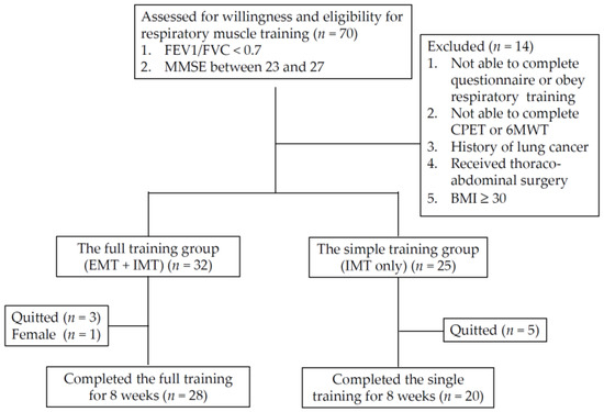 Our study was a prospective study that was approved by the Institutional Review Board-I (107-A-09 Board Meeting) of Taichung Veterans General Hospital (protocol code: CF18259A; date of approval: 4 October 2018; clinical trial number: NCT04929990). Participants were recruited from the outpatient department of chest medicine in a tertiary referral center, and written informed consent was obtained from them or their authorized representatives before enrolment. Patients with the following criteria were enrolled: (1) a definitive diagnosis of COPD based on a FEV1/forced vital capacity (FVC) value of less than 0.7 at 10–15 min after short-acting beta-2 agonist (SABA) inhalation, and (2) an MMSE score between 23 and 27. The exclusion criteria were as follows: (1) being unable to follow RMT instructions or complete the questionnaires of our study due to cognitive impairment; (2) difficulty in completing cardiopulmonary exercise testing (CPET) or the 6 min walking test (6MWT) due to high-risk cardiopulmonary diseases or orthopedic conditions, such as critical aortic stenosis, early stage of post myocardial infarction, or lower limb amputation; (3) a diagnosis of lung cancer or a history of thoracoabdominal surgery; and (4) a body mass index (BMI) of ≥30.