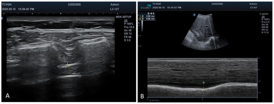 Diaphragmatic thickness fraction and excursion were measured using an ultrasound machine (Alpinion E-cube i7, who Medical Co., Ltd., Taipei, Taiwan). With the participant in the supine position, diaphragmatic thickness at the intercostal space between the 7th and 8th or the 8th and 9th ribs in the anterior axillary line was examined using a high-frequency ultrasound probe (10–15 MHz). The thickness of the diaphragmatic apposition zone was visualized below the intercostal muscles (Figure 1). The diaphragmatic thickness fraction was calculated as follows: (end-inspiration thickness—end-expiration thickness)/end-expiration thickness [23]. Diaphragmatic excursion was measured by placing a 2–6-MHz ultrasound probe at the right mid-clavicular line, and the amount of movement of the posterior edge of the liver was traced and measured using M mode ultra-sonography [24]. Limitations, such as the variations of probe tilting angle and the impact of the increased echogenicity of the liver, were considered in our study. The sonographic measurements were performed by one single examiner, which could reduce the inter-observer variability, and none of our participants’ liver echogenicity was too high to clearly identify the posterior edge of liver.
