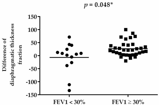 The subgroup analysis of the RMT training effect between different severities of FEV1 in patients with COPD was compared (Table 4). After 8 weeks, both groups exhibited increases in FVC (%), FEV1 (%), and the distance of 6MWT; and decreases in CAT score, mMRC score, and Borg scale sore (Table 4). In addition, cognitive function in terms of the MMSE score improved in both groups. However, only diaphragmatic thickness fraction exhibited significant between-group differences in improvement (p = 0.044) (Figure 3).