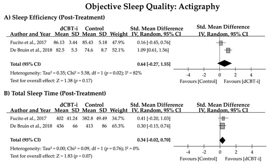 The two studies that reported sleep parameters measured using actigraphy at the post-treatment assessment enabled examination of the effect of dCBT-i on objective SQ (Figure 3). Heterogeneity estimates revealed an I2 of 82% and 0% for SE and TST, respectively. No statistical significance was observed for SE (g = 0.64 [95% CI = −0.27, 1.55]; z = 1.38, p = 0.17) or TST (g = 0.34 [95% CI = −0.02, 0.70]; z = 1.83, p = 0.07) after treatment.