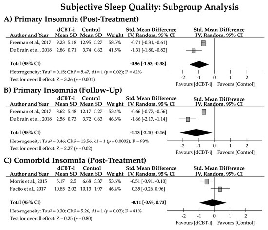 As depicted in Figure 4, high heterogeneity was observed in subjective SQ (81–93%) in the subgroup analysis. The pooled effect sizes for primary insomnia after treatment (g = −0.96 [95% CI = −1.53, −0.38]; z = 3.26, p = 0.001) and at the follow-up (g = −1.13 [95% CI = −2.10, −0.16]; z = 2.27, p = 0.02) were significant, but the effect size for comorbid insomnia after treatment failed to reach significance (g = −0.11 [95% CI = −0.95, 0.73]; z = 0.25, p = 0.80). Moreover, a pooled NNT of 2.08 (2.60 and 1.55) and 2.05 (2.78 and 1.32) was noted for primary insomnia after treatment and at the follow-up, respectively. Two studies on comorbid insomnia, however, obtained contrasting results, with NNTs of 3.55 and −5.12 at the post-treatment assessment.