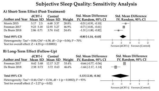 Sensitivity analysis of the short- and long-term effects of dCBT-i on subjective sleep quality (SQ). Subjective SQ was evaluated using the Pittsburgh Sleep Quality Index (PSQI; Morris et al., 2015 [30]), Insomnia Severity Index (ISI; Freeman et al., 2017 [43]), or Holland Sleep Disorder Questionnaire-Insomnia (HSDQi; De Bruin et al., 2018 [45]). SD, standard deviation; CI, confidence interval.