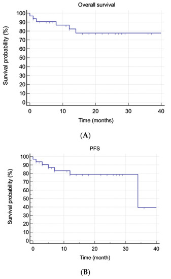 At the time of writing, no patient has been lost to follow-up. The median actual follow-up was 17 months (IQR, 1–34). Overall, six (18.1%) patients died, three of them due to disease progression and three due to SAEs. Five (15.2%) patients relapsed, and three (9.1%) patients were considered refractory to daratumumab. The mean OS was 34.9 months (95% CI, 29.25–40.69), whereas the mean PFS was 30.63 months (95% CI, 25.02–36.24). The median OS was not reached, whereas the median PFS estimate was not reached at 34 months (95% CI, 34–34). Achieving hematological response was the only statistically significant predictive factor for better OS and PFS (p = 0.0002 and p < 0.0001, respectively) (Figure 1).