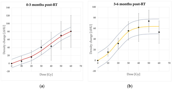 The lung density, expressed by the HU values, increased significantly (p < 0.05) compared to the baseline values for all time and dose intervals, apart from 5–10 Gy and 10–20 Gy ranges in the earliest phase—0–3 months (p = 0.233435, p = 0.077162, respectively) and 5–10 Gy and 10–20 Gy ranges in 6–9 months (p = 0.701978, p = 0.167319). The mean HU response was well described sigmoidally with a presumed model (Figure 1) as the data points within consecutive time intervals fit the logistic function (Equation (1)) rightly. Maximum ΔHU ranged from 25.4 (14.4–36.4) HU to 96 (85.5–106.5) HU. The dose points at which the saturation of HU changes is reached (D95) differed between time intervals. Our model estimates started from 70.2 Gy for the earliest changes and decreased to 38.4–31.6 Gy for 3–6, 6–9, and 9–12 month periods to increase after 12 months to 45.1–53 Gy.