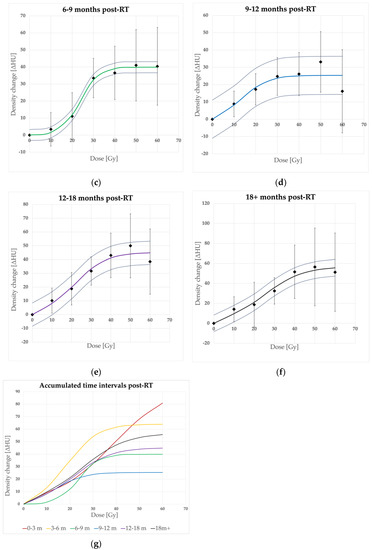 Dose-response sigmoidal model fit in consecutive time intervals. Density changes in time intervals after RT completion: (a) 0–3 months, (b) 3–6 months, (c) 6–9 months, (d) 9–12 months, (e) 12–18 months, (f) over 18 months, and (g) accumulated curves. 95% CI bars (for mean ΔHU data points) and curves (for models)—omitted in (g) for clarity.
