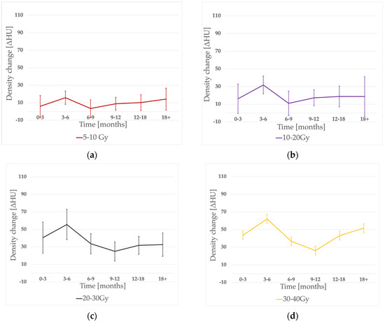 The time evolution of density changes is shown in Figure 2. As expected, the noticeable peak of ΔHU was seen within 3–6 months post-RT in almost all of the dose-bins (besides the 50–60 Gy range, when it occurred earlier). However, there was no significant difference between the 0–3 and 3–6 months periods (p = 0.43). Then, a significant (p = 0.03) decrease in density occurred, reaching its nadir at 6–9 months for lower doses (5–10 Gy, 10–20 Gy bins) and 9–12 months for the rest of the dose ranges. A consecutive, significant (p = 0.03) dose increase was observed in the whole dose range. The earlier ΔHU peak was significantly higher than the later one (p = 0.036).