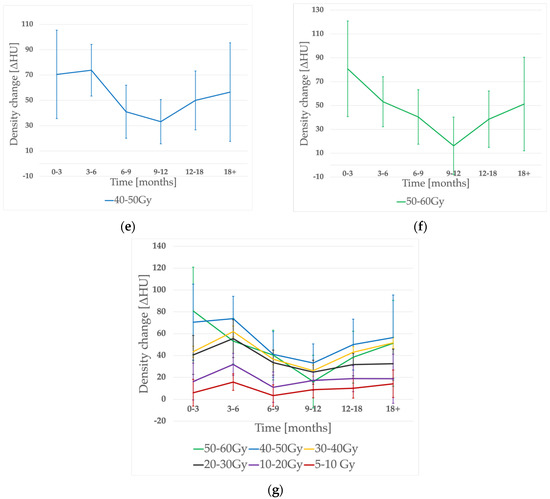 Density change evolution in time for different dose-bins: (a) 5–10 Gy, (b) 10–20 Gy, (c) 20–30 Gy, (d) 30–40 Gy, (e) 40–50 Gy, (f) 50–60 Gy, and (g) accumulated graph.