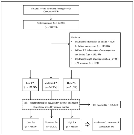 The participant selection flow. Out of a total of 948,390 participants with osteoporosis, ‘high PA’ (n = 58,620), ‘moderate PA’ (n = 58,620), and ‘low PA’ (n = 58,620) were matched by a ratio of 1:1:1 by age, gender, income, and region of residence. Abbreviation: fxs, fractures; PA, physical activity; SES, socioeconomic status.