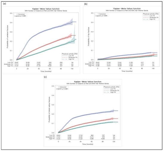 Cumulative rate of each fx was higher in order of the ‘low PA’, ‘moderate PA’, and ‘high PA’ groups (log-rank test, each p < 0.001, Figure 2).