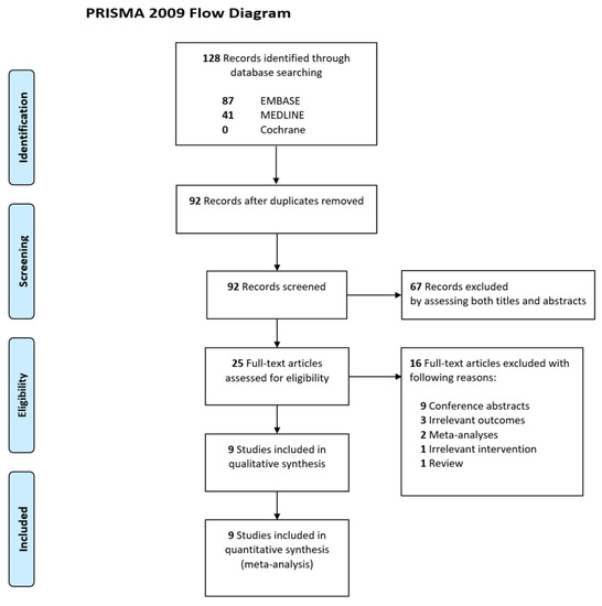 A flow diagram of the literature search for this systemic review is shown in Figure 1. Overall, 128 records were identified using the database search. Thirty-six duplicate records were removed, and 67 additional irrelevant records were excluded after screening the titles and abstracts. After the full texts of the 25 remaining records were reviewed, we excluded 16 records for reasons such as conference abstracts (n = 9), irrelevant outcome measures (n = 3), meta-analyses (n = 2), irrelevant intervention (n = 1), and reviews (n = 1). Finally, nine observational studies that enrolled a total of 791 patients were included in the meta-analysis [1,3,6,16,17,18,19,20,21].