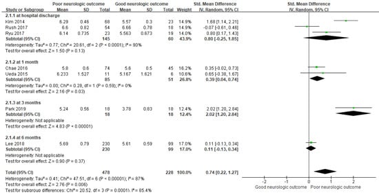 Seven studies had neurological outcomes as the main outcome measurements [1,6,17,18,19,20,21]. On the measurement time of outcomes, there were three studies at hospital discharge, two studies at 1 month, one study at 3 months, and one study at 6 months. Five studies reported mortality as a patient outcome [3,6,16,18,20]: two studies at hospital discharge and one study at 6 months.