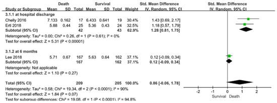 There was no significant difference in ONSD between survival and death (3 studies; SMD = 0.86; 95% CI = −0.06–1.78; I2 = 90%; p = 0.07; Figure 3).