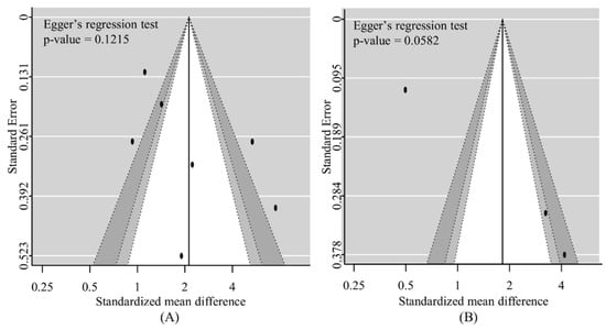There was no definite asymmetry in the forest plots. No significant publication bias existed statistically in the assessment based on the Egger’s regression test with studies for predicting neurological outcomes (p = 0.1215) and death (p = 0.0582) (Figure 5).