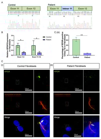 3.3. Novel RPGR Intronic Variant Creates an Alternate Splice Acceptor Site and Loss of RPGR Expression, Especially at the Transition Zone in Fibroblast Primary Cilia