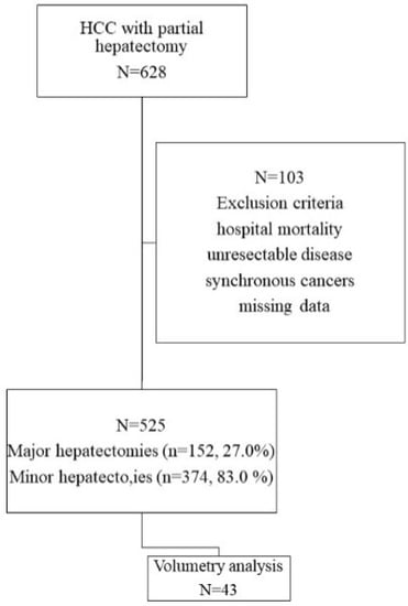 Of 628 HCC cases with intended curative treatment from 2012 till 2018, 103 patients with hospital mortality, unresectable disease, synchronous cancers or missing data were excluded. A total of 525 patients with partial hepatectomy were enrolled for the analysis of perioperative parameters for long-term outcomes. The study endpoint was February 2021. The median follow-up time was 42.6 months, and the mean was 45.5 ± 23.3 months (IQR, 25th–75th percentiles, 28.6–66.0). The tumor staging was based on the 8th edition of the American Joint Committee on Cancer TNM staging system for HCC [13]. This retrospective cohort study was approved by the Institutional Review Board (IRB 201701002B0) of Chang Gung Memorial Hospital, Linkou Branch, and informed consent was waived. The study design is shown in the flow chart (Figure 1).