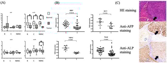 Higher expression of liver-specific alkaline phosphatase (ALP) in hepatocellular carcinoma (HCC) non-cancerous areas. (A) Analysis of genetic expression in HCC non-cancerous (N) and tumor (T) areas shows significant elevation of ALP. (B) Higher genetic expression of ALP is consistent among different patient etiologic factors. (C) Representative immunohistochemical staining of α-fetoprotein (AFP) and ALP in HCC. Stronger staining is noted at non-cancerous tumor area for ALP and tumor area for AFP (200 × X magnification). (* p < 0.05).