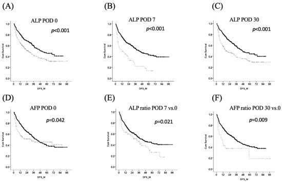 The analysis of recurrence-free survival. Kaplan–Meier survival curve for AFP and ALP in HCC in the perioperative period. (A), (B) and (C) Higher ALP in perioperative period at POD 0, 7 and 30 represented significant risk for HCC recurrence (p < 0.001). (D) AFP more than 200 ng/mL is a risk factor for recurrence, too. (E) and (F) ALP ratio > 1.46 (POD 7 vs. POD 0) and AFP ratio (POD 30 vs. POD 0) > 1.519 were independent factors for recurrence-free survival. Abbreviations: alkaline phosphatase (ALP) and α-fetoprotein (AFP).