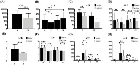For all the patients, the AFP was significantly decreased after hepatectomies, but the ALP significantly decreased at POD 2 and increased at POD 30 in all the patients (p < 0.001) (Figure 4A,B). A significantly inverse presentation between the perioperative changes in AFP and ALP was noted. HCC patients with major hepatectomies showed higher perioperative serologic changes and had higher LRRs, compared with the minor group (Figure 4D–H). The AST and ALT levels, representing the degree of liver damage, rose to the highest levels at POD 2, but the ALP level was decreased at POD 2 and increased at POD 7 and POD 30. Therefore, ALP, released from the nontumor part after resection, represented a dynamic change in the liver remnant.