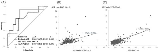 The perioperative ALP change and liver regeneration. (A) Total of 43 patients with volumetry analysis; AUROCs for liver regeneration rate >1.8 of ALP ratio (POD 30 vs. POD 0) and ALP at POD 30 were 0.808 (0.658–0.958) and 0.709 (0.540–0.878) (p = 0.002 and 0.031, respectively). (B) The increase in ALP after partial hepatectomies. The ALP ratio of POD 7 vs. 0 was significantly correlated with that of ALP POD 30 vs. 0 (Pearson correlation = 0.757, p < 0.001). (C) The ratio of ALP at POD 30 vs. 0 was significantly correlated with that of ALP at POD 30 (Pearson correlation = 0.919, p < 0.001).