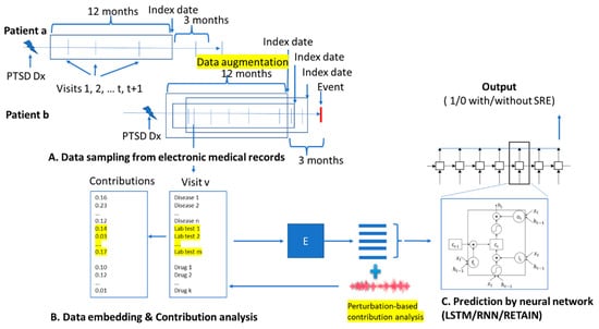 Deep learning/data mining algorithms can translate data into information for hypothesis generation through deep hierarchical feature construction to capture long-range dependencies in EMR data [22]. Recently, a variety of deep learning techniques and frameworks have been applied to information extraction, representation learning, outcome prediction, phenotyping, and de-identification [23,24,25,26,27] and have yielded better performance than traditional methods and required less time-consuming preprocessing and feature engineering. Specifically, deep learning techniques learn optimal features directly from the data itself, without any human guidance, allowing for the automatic discovery of latent data relationships that might otherwise be unknown or hidden [28]. Current biological research has identified group-level risk factors for PTSD and/or SREs, which may not accommodate multi-modal information (lab tests, medication use, diagnosis) [29]. Since deep learning models overcome this shortcoming, they may help in establishing more putative biomarkers.