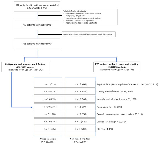 This study included 695 patients with PVO (Figure 1), of whom 368 (53%) were women, with a mean age of 69.2 years (range, 20–92 years). The patients were divided into two groups based on the presence (n = 175, 25%) or absence (n = 520, 75%) of concurrent infections (Figure 1).